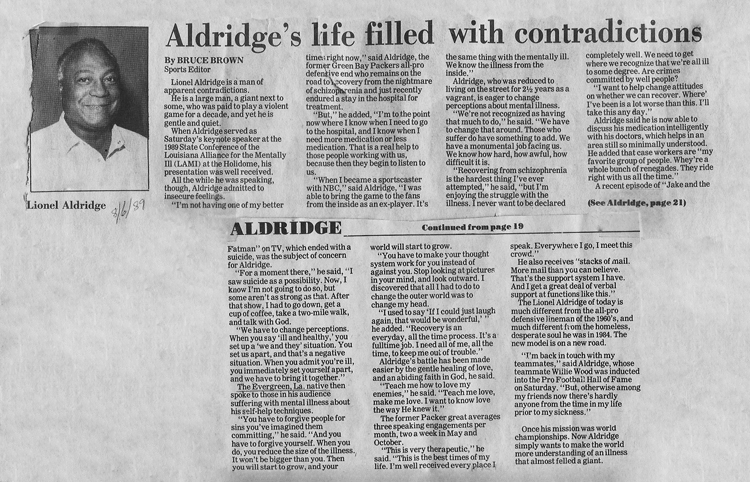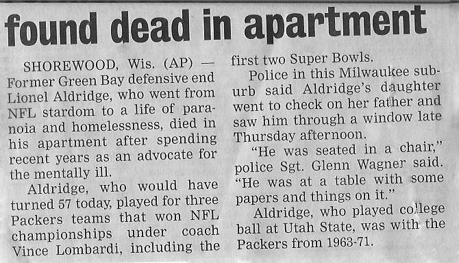 In response to questions about the outstanding athletes who were residents of the Evergreen area, attempts have been made to identify some of them who should be included. As I reviewed my files, I realized that Lionel Aldridge, former Green Bay Packer great, who played in the first Super Bowl, should certainly be included in the group of outstanding athletes.